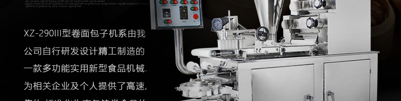 旭眾牌XZ-290III型卷面式包子機是由本公司自主設計研發,精工打造的一款專業仿手工生產制作各種包餡類食品的高效實用型機械設備,是一款生產肉包、菜包、小籠包、豆沙包、奶黃包等多種包餡類產品的多功能實用新型食品機。
