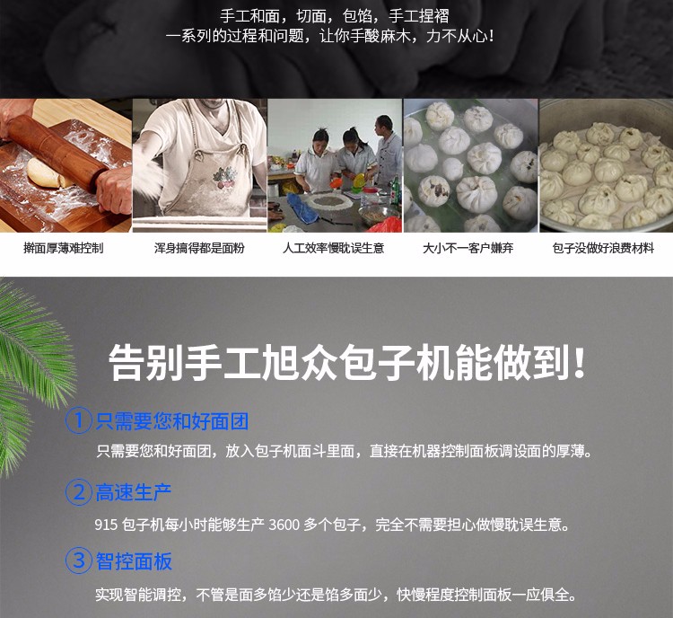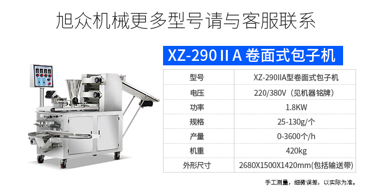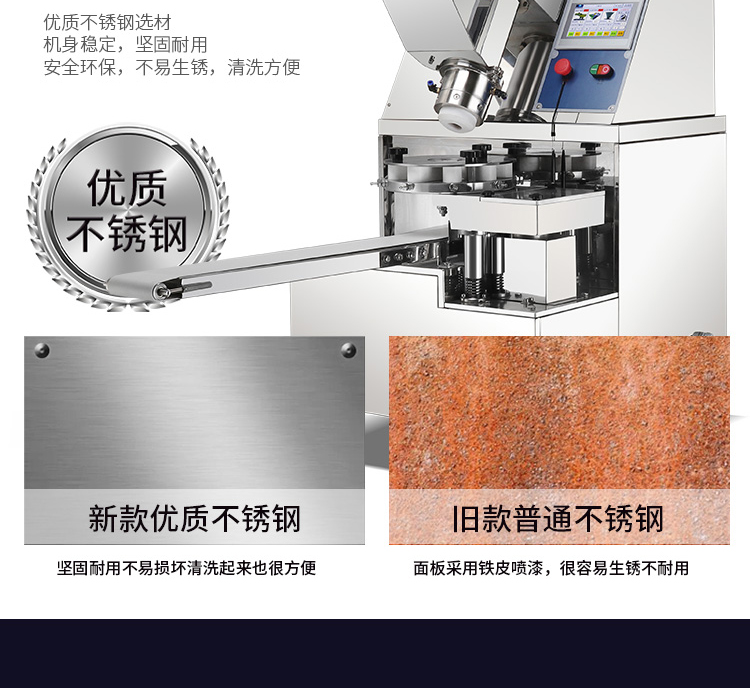 旭眾牌XZ-915全自動(dòng)包子機(jī)體積小重量輕,外殼及接觸食品部分均由不銹鋼制造,外觀精美耐用;采用三變頻無(wú)極變速調(diào)控,生產(chǎn)性能穩(wěn)定。設(shè)計(jì)先進(jìn),結(jié)構(gòu)簡(jiǎn)單,操作方便。包子機(jī)三大特色: