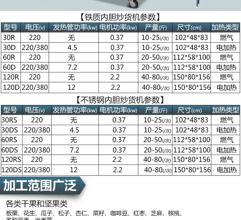 1.炒貨機(jī)有30型.60型.120型三種,每個型號各有燃?xì)饧訜岷碗娂訜醿煞N方式。