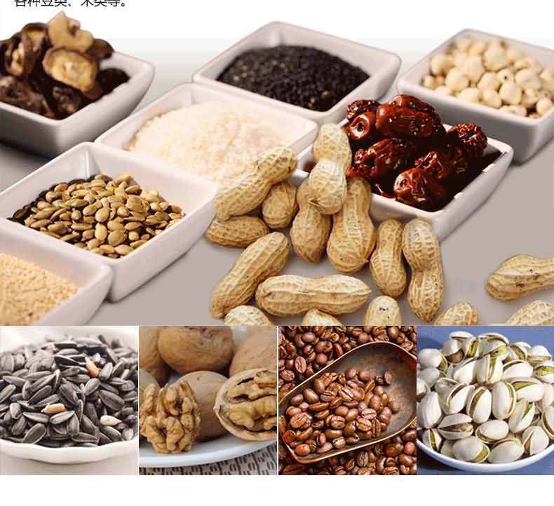 7.適合加工各種干果和堅果類,如;板栗、花生、瓜子、松籽、榛子、杏仁、菜籽、咖啡豆、紅棗、芝麻、、核桃、各種豆類、麥類、米類等。適用于在各大商場、超市、食品專賣店、連鎖店、街道小吃等人口密集區(qū)等處定點經(jīng)營和加工。是您創(chuàng)業(yè)致富的好幫手。