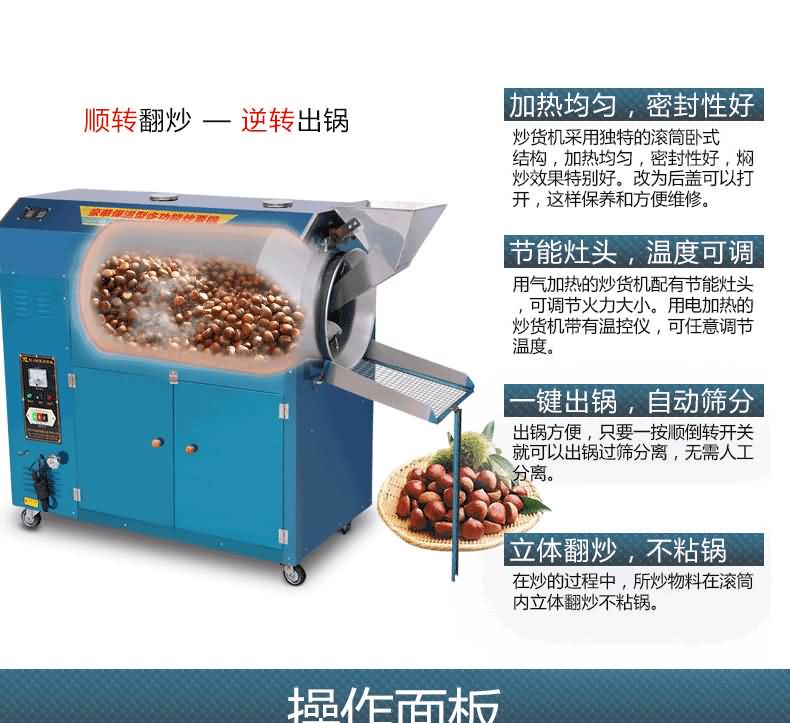 3.用氣加熱的炒貨機(jī)配有節(jié)能灶頭,可調(diào)節(jié)火力大小。用電加熱的炒貨機(jī)帶有溫控儀,可任意調(diào)節(jié)溫度。