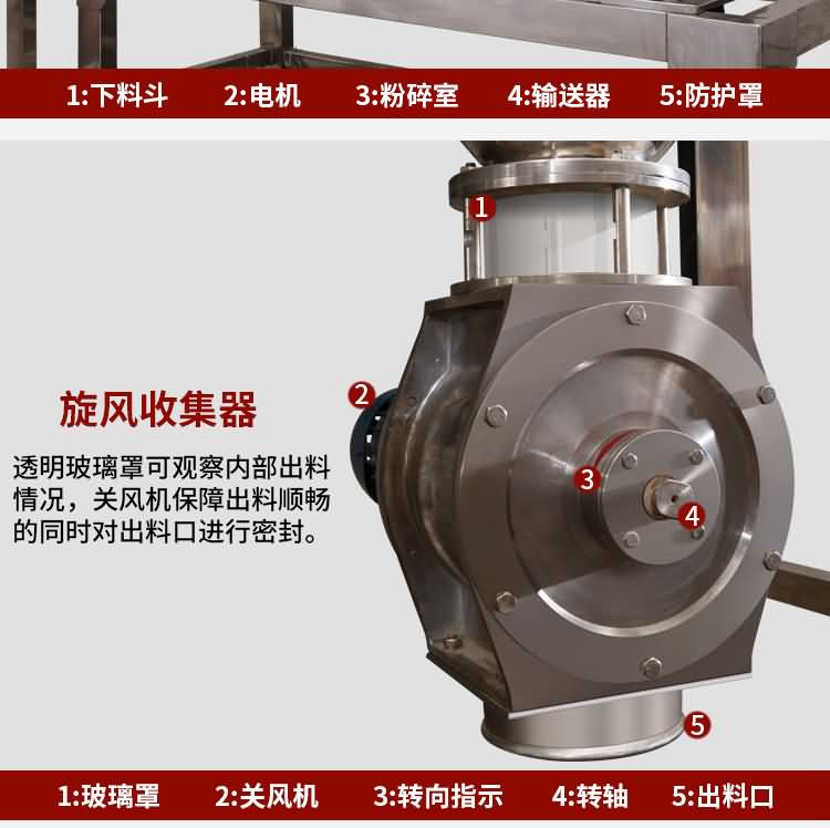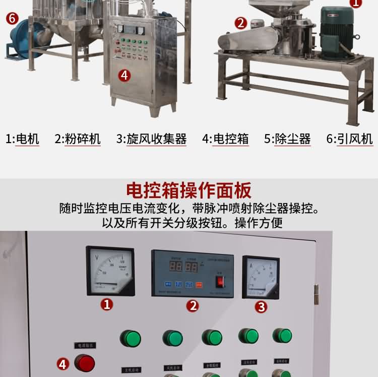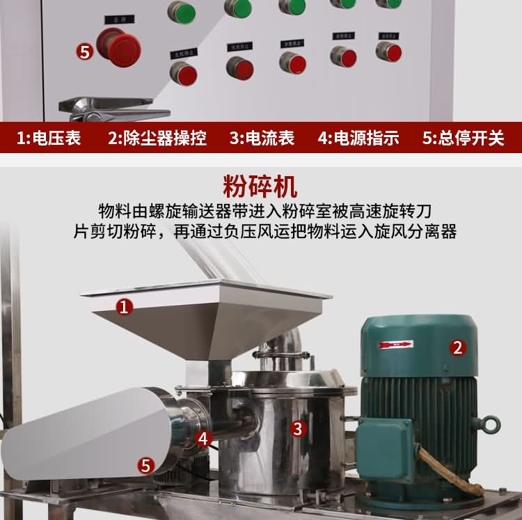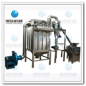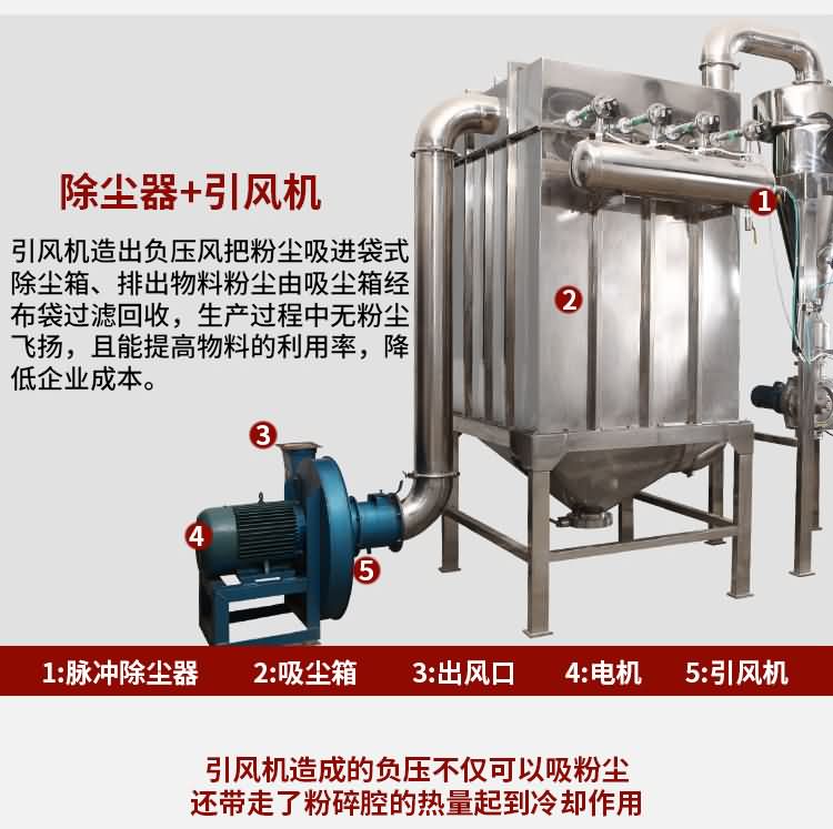 各型號超微粉碎機組都含主機、可調速的螺旋送料器、旋風收集器加氣錘震蕩裝置、袋式除塵箱加氣流脈沖裝置、引風電機造成負壓。大功率引風電機不但可使輸送管道形成負壓,使達到要求的細粉自動被風力吸入管道,而且巨大的風量還帶走了粉碎腔內不斷產生的熱量,同時對粉碎機組的管道起到一個強有力的清理效果。旋風收集器出料口加裝了關風機,出粉口無粉塵飛揚,達到了清潔、環保、節約的效果。