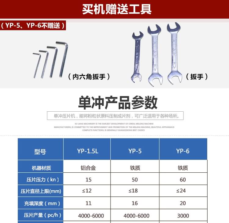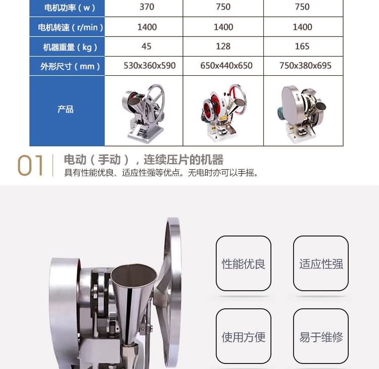 名稱單沖壓片機系列 電源 功率 產(chǎn)量 尺寸 重量 規(guī)格 其他