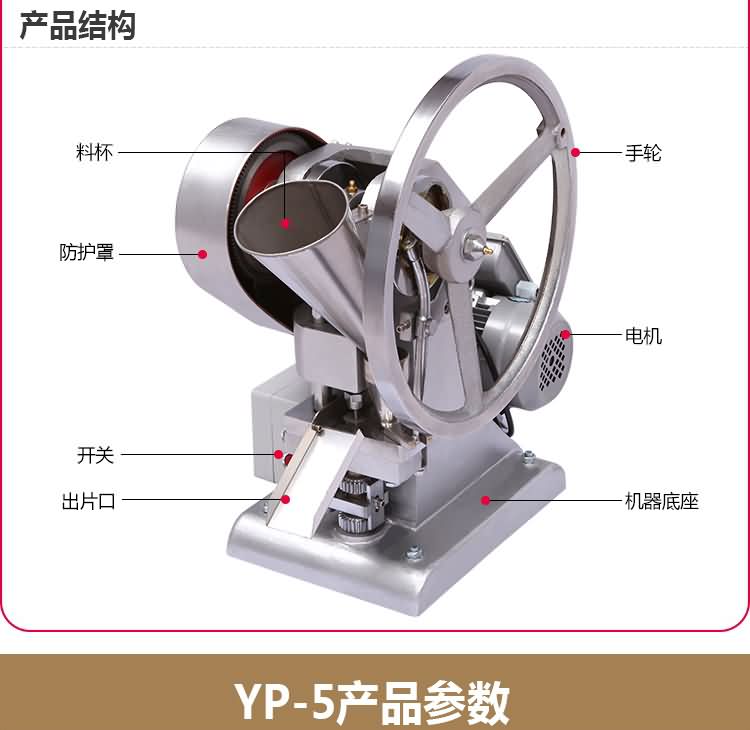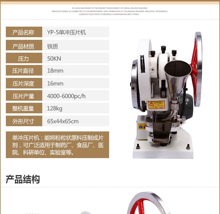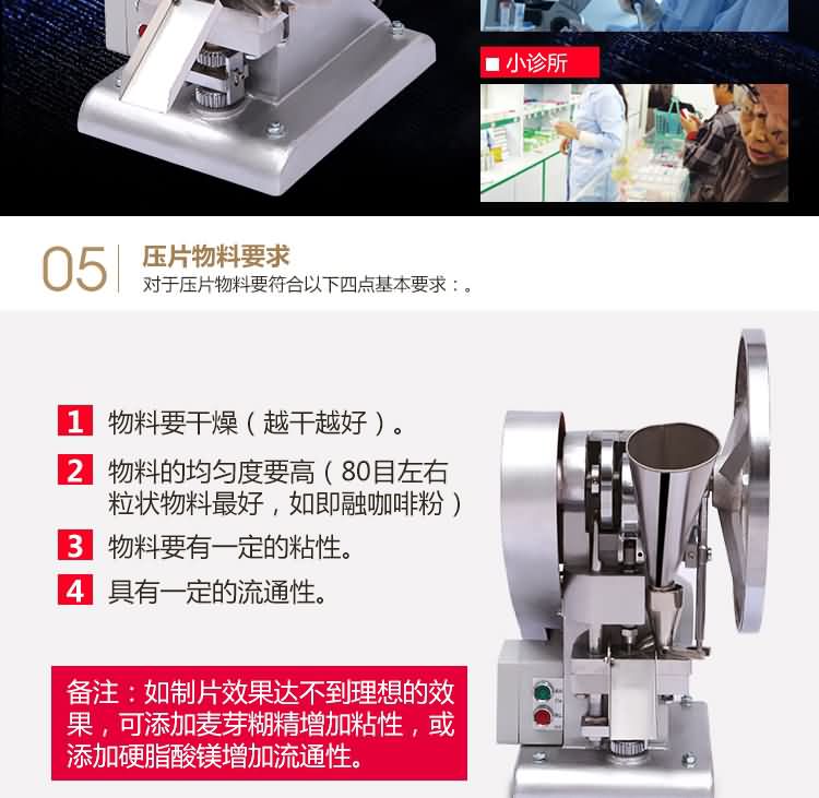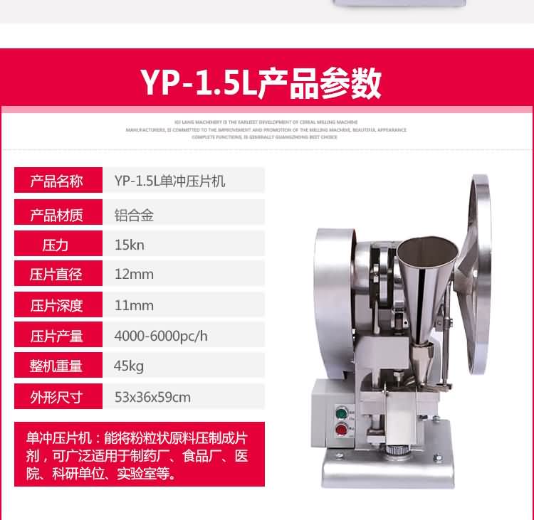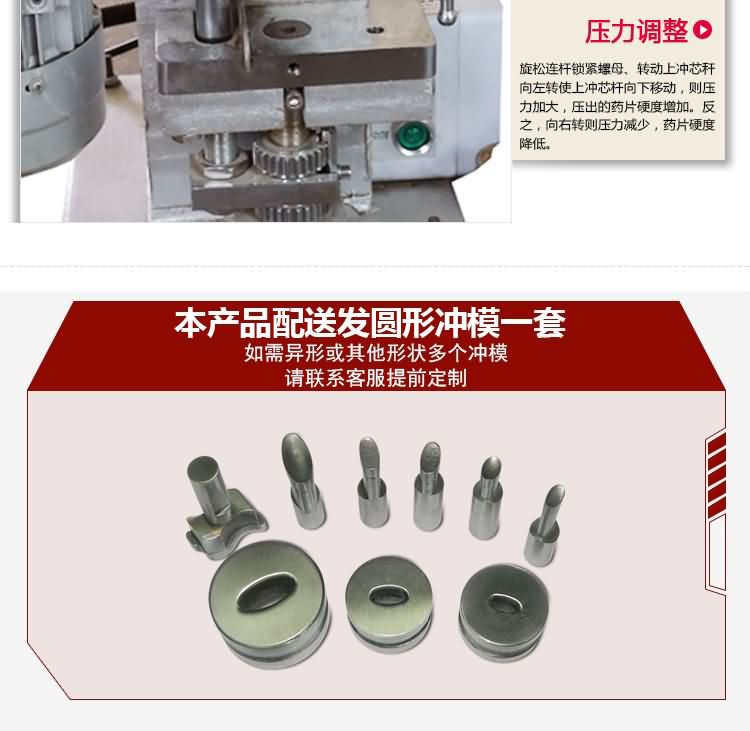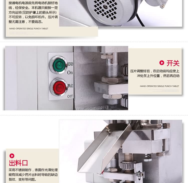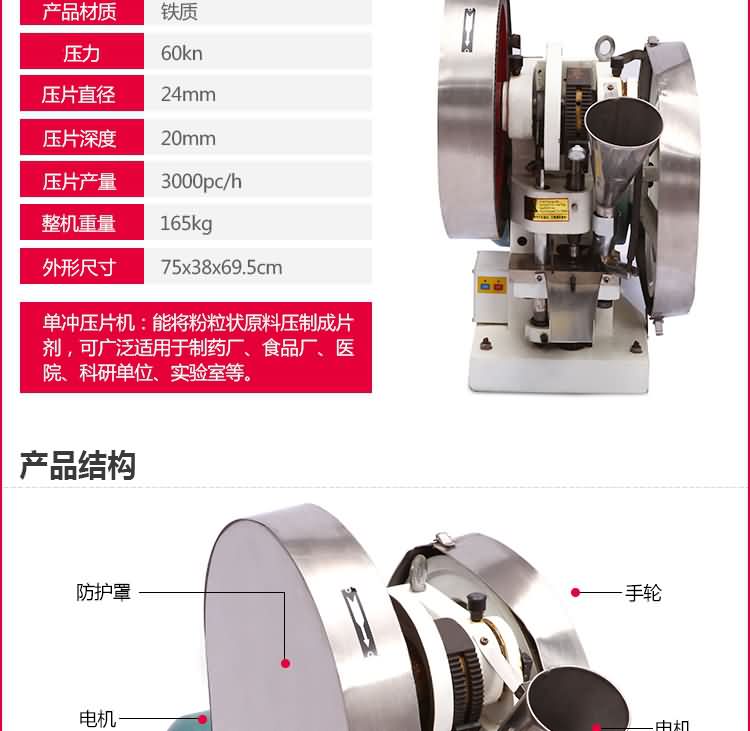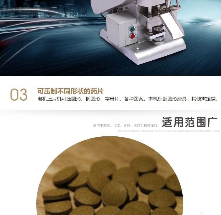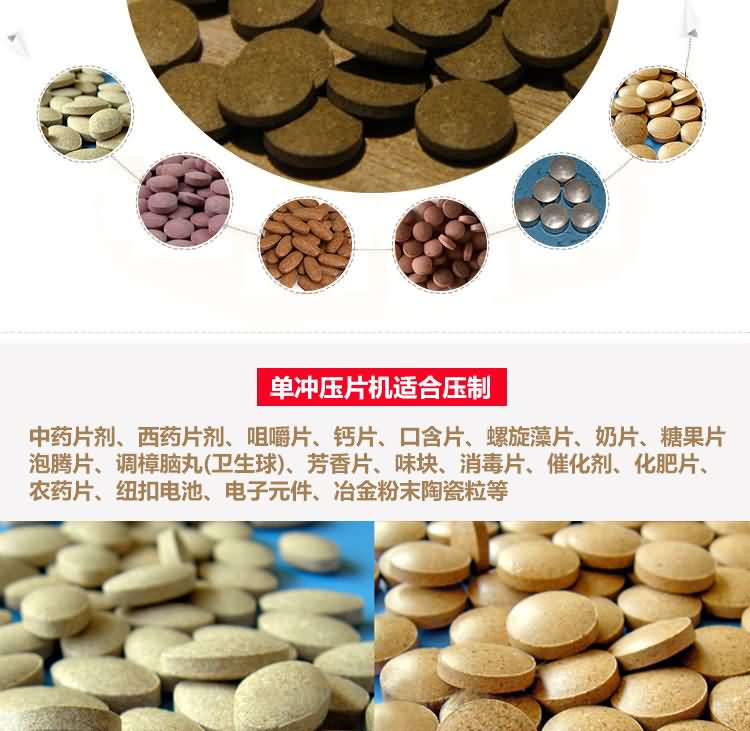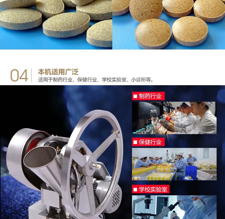 單沖壓片機適合壓制中藥片劑、西藥片劑、咀嚼片、鈣片、口含片、螺旋藻片、奶片、糖果片、泡騰片、調(diào)樟腦丸(衛(wèi)生球)、芳香片、味塊、消毒片、催化劑、化肥片、農(nóng)藥片、紐扣電池、電子元件、冶金粉末陶瓷粒等。是一種小型臺式電動(手動)連續(xù)壓片的機器,機上裝一付沖模,物料的充填深度,壓片厚度均可調(diào)節(jié)。可根據(jù)客戶要求提供各種形狀的模具。單沖壓片機能將粉粒狀原料壓制成片劑,可廣泛適用于制藥廠、化工廠、醫(yī)院、科研單位、實驗室試制和小批量生產(chǎn)。本機性能優(yōu)良,適應(yīng)性強,使用方便,易于維修,體積小,重量輕,無電時也可手搖片。本機只裝一付沖模,物料的充填深度,壓片厚度均可調(diào)節(jié),能適應(yīng)制藥行業(yè)壓制各種中、西藥征劑的要求和其它行業(yè)壓制各種類似產(chǎn)品的要求,深受各行業(yè)廣大用戶的歡迎。