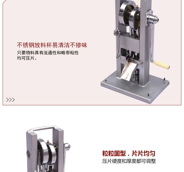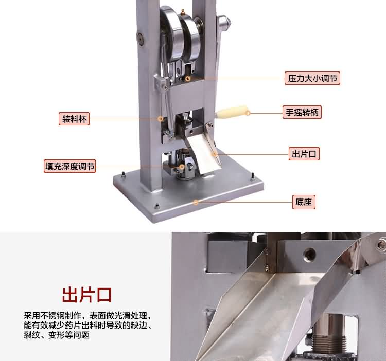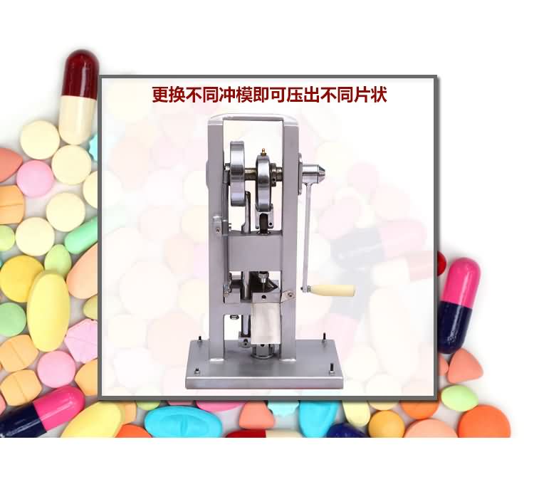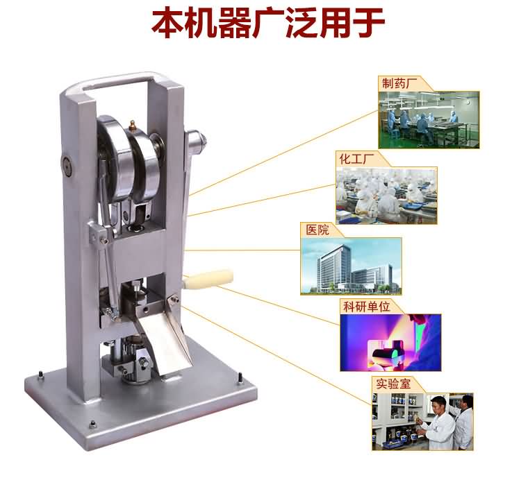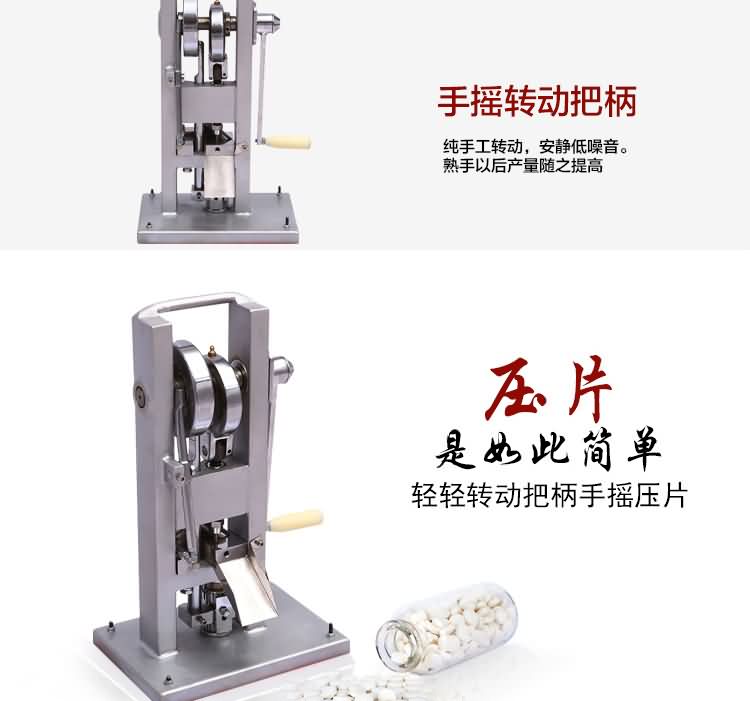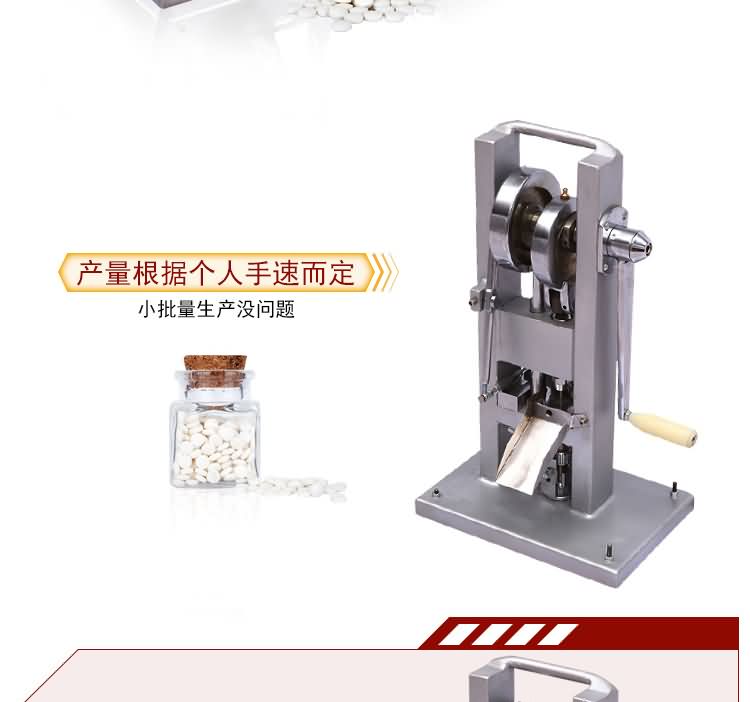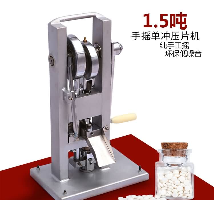 手搖式單沖壓片機沒有電機傳動,無需電源。用以將各種顆粒狀原料壓制成圓片,適用于實驗室試制、教學、小規(guī)模生產(chǎn)各種藥片、糖片、鈣片等,是一種小型臺式連續(xù)壓片的機器,性能優(yōu)良,適應性強,使用方便,易于維修,體積小,重量輕,本機只裝一付沖模,物料的充填深度、壓片厚度均可調(diào)節(jié),能適應制藥行業(yè)壓制各種中、西藥片劑的要求和其它行業(yè)壓制各種類似產(chǎn)品的要求,深受各行業(yè)廣大用戶的歡迎。