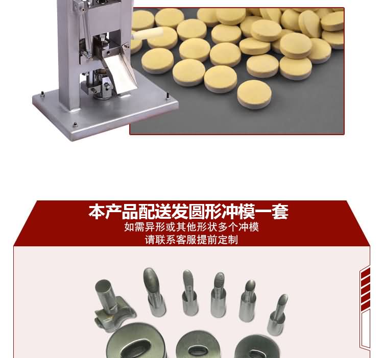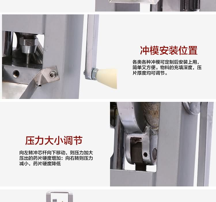 A、充填;B、沖壓成形;C、出片。三道程序連續(xù)進行,其每道程序均可調(diào)節(jié),適合各種片劑的成形。該機具有體積小,分量輕,造型美觀,結(jié)構(gòu)緊湊,操作簡易,用途廣泛,不需用電便于攜帶等優(yōu)點,人工手搖即可,只要換上不同規(guī)格的模具即可得到所需的片劑。