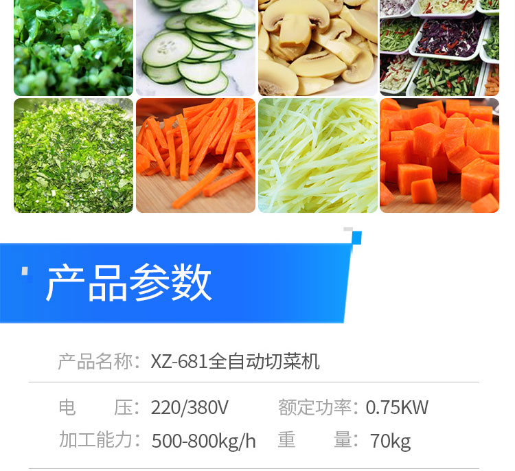 XZ-681多功能切菜機(jī),本設(shè)備可切葉菜可切片、絲、段等,葉菜類,切割尺寸: 1 - 60mm 可以調(diào)整,適用客戶群:食品廠,凈菜加工;學(xué)生營養(yǎng)餐,餐飲連鎖,中央廚房,企業(yè)食堂等。