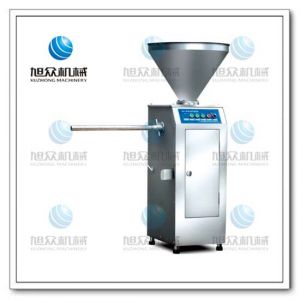 XZ-I小型自動定量灌腸機該機使用優質不銹鋼制造,符合食品機械的要求,只需1人操作,特別適合中小型肉食加工廠使用,以各種畜禽類肉糜為原料的香腸、火腿腸、熱狗等,可以灌制定重量單腸,也可連續灌制長腸,單腸重量在50-1000克之間,有刻度連續可調,定量準確,誤差<2%,料斗一次裝料57升。特點是連續作業,加料時不需停機,生產效率高,每小時達100-500千克,工作結束后清洗方便,整機重量僅130千克,移動方便,機腳可調。
