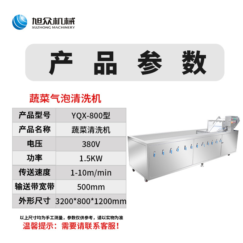 旭眾牌YQX-800蔬菜清洗機對清洗水進行消毒處理,有效的殺滅有害細菌,分解殘留農藥;通過活性炭過濾后的清洗水循環利用,可節約80%的清洗用水用于清洗蘑菇、芹菜、菠菜、白菜等莖葉類蔬菜以及蘋果、西紅柿、辣椒、茄子、黃瓜、草莓等果蔬的主要設備,廣泛適用于蔬菜加工行業及廠礦、部隊、醫院、各大專院校等單位的食堂。