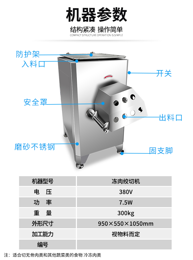 名稱GC-D120凍肉絞肉機 電源380V 功率7.5kw 產量由物料而定 尺寸950*550*1050mm 重量300kg 規格 其他