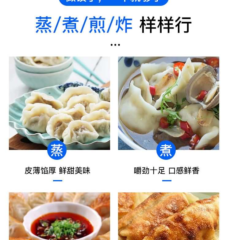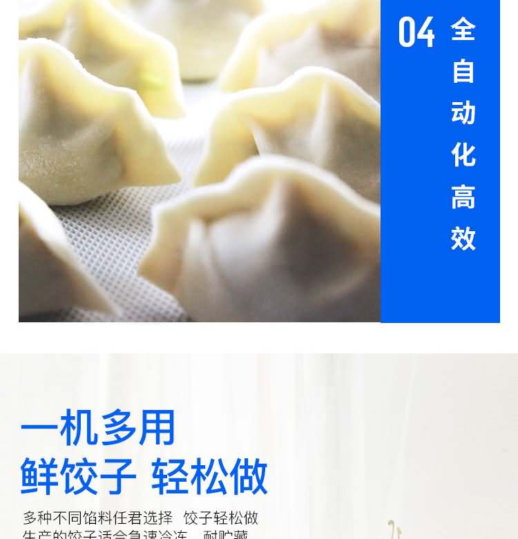 ◆包制出來的餃子可蒸、煮、炸、煎等多種調理,所生產(chǎn)的制品均適合急速冷凍,耐貯藏,是理想的微波爐食品;