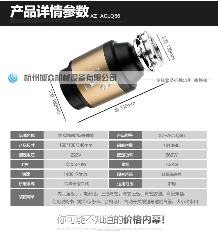 名稱ACLQ56-廚房垃圾處理器 電源220V 功率0.56kw 產量 尺寸 重量7.5kg 規格 其他轉速1480R/min,研磨倉容量1310ML
