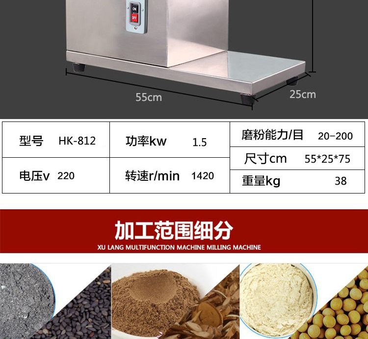 HK-812小型磨粉機,全銅優質電機,動力夠!力氣足!產量也可以達到每小時10-30公斤,能將各種糧食、中藥材等物料研磨成50~200目的均勻粉末。