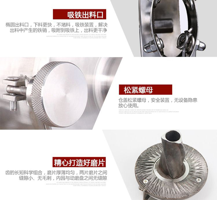磨粉機的電機啟動運轉時,連接軸帶動連接軸上的磨盤一起運轉。待磨物料從料斗進入磨粉套,磨盤把物料帶入兩磨片中,物料經過兩磨片之后,在離心力的做用下,甩向四周,同時被裝在磨盤上的刮粉板帶下,從下料口出來。
