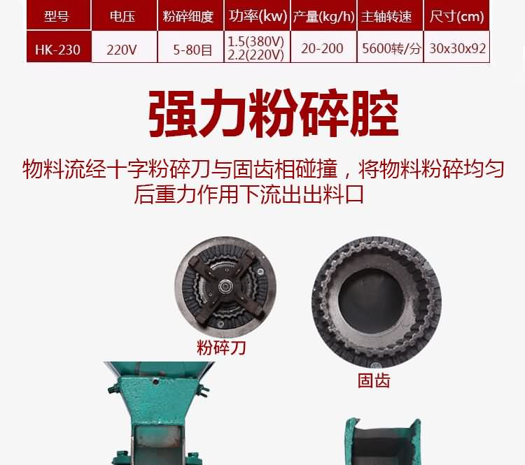 HK-230型多用粉碎機體積不大,功能強勁,粉碎量大,適用范圍廣,對各種糧食、大部分中藥材均能達到比較理想的粉碎效果,出料塊,操作簡單。可以配套220V或者380V電機,屬高速錘式粉碎機,進入粉碎腔的物料和高速運轉的錘片碰撞以及物料間相互撞擊,從而達到快速粉碎的理想效果。適合加工粉碎各種糧食、中藥材、樹根、樹枝、木頭、礦石、干燥果皮和瓜類等物料。適合生產、加工使用,也可以作為混合物料使用。