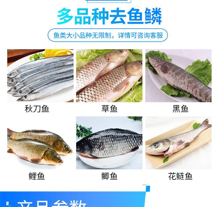 名稱去魚鱗機 電源220V 功率2.2kw 產量1-50斤/35秒 尺寸1050×550×850mm 重量110kg 規格0.5-5斤 其他