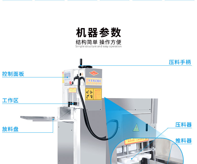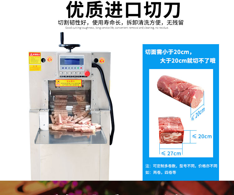 4.自動化程度高,肉片切制,厚度調節。肉卷輸送,自動停機。均可一鍵完成,省工省時