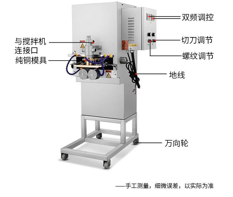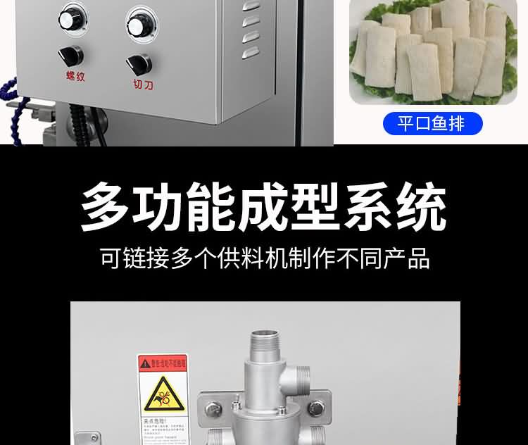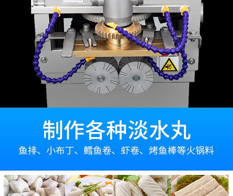 采用雙電機雙變頻設計,不單只是速度可調,而且產品上的條紋旋度也可調,使得做出的產品更多樣化,操作起來更方便。特別配備滾切刀,能生產出平口和圓口的淡水丸,具有一機多用的特點。