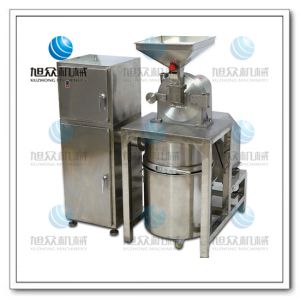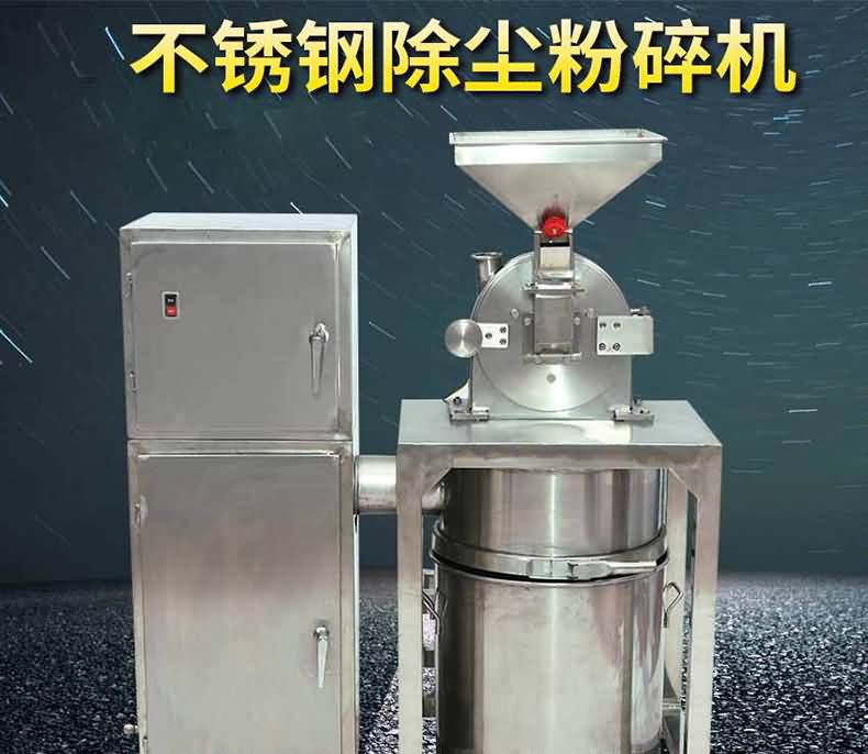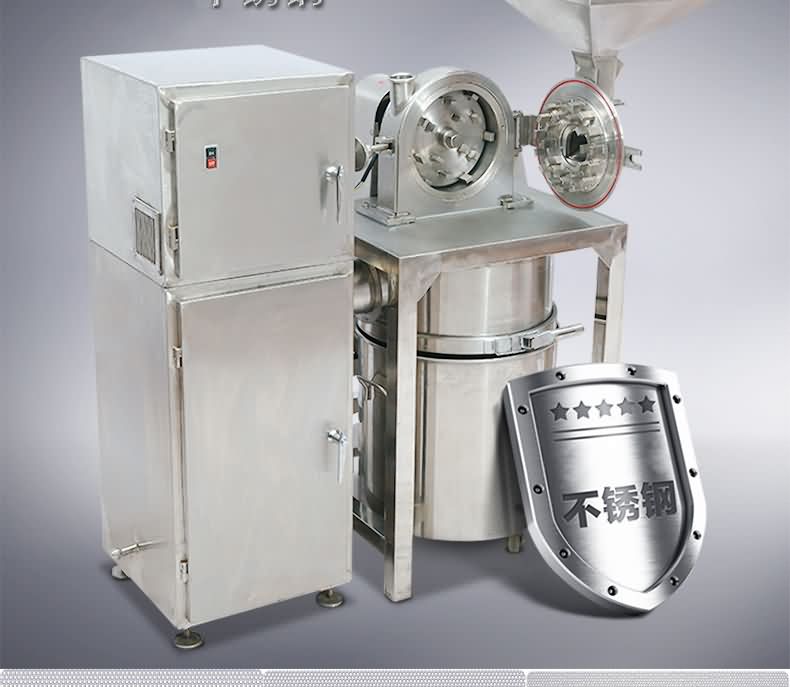 不銹鋼除塵粉碎機,全不銹鋼制造,304材質,符合GMP要求。主要適用于制藥、化工、食品等行業的物料粉碎。本機利用活動齒盤和固定齒盤的相對運動,以及物料之間的相互撞擊作用,從而使粉碎腔內的物料獲得破碎、粉碎。本機配備篩網,篩網可以根據客戶要求進行更換,當物料被粉碎到小于篩孔直徑時,粉劑從篩網中出來,落入下方的集料桶內,在桶內飄揚的粉塵則通過除塵電機的作用被吸入到除塵箱內的除塵袋中過濾,空氣由風機排出室外。