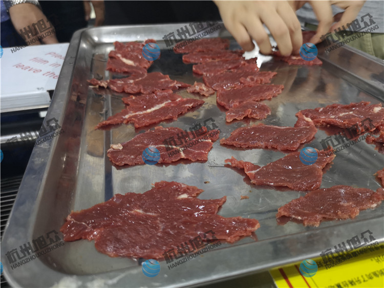 牛肉加工廠的福利,全自動斜切牛肉片/魚片機適用于肉類加工廠,魚類加工廠,大型餐飲行業等單位。全自動斜切魚片機切2.5mm鮮牛肉片效果如圖: