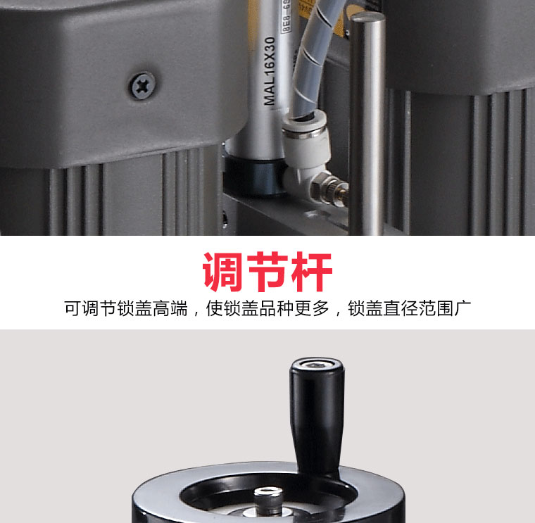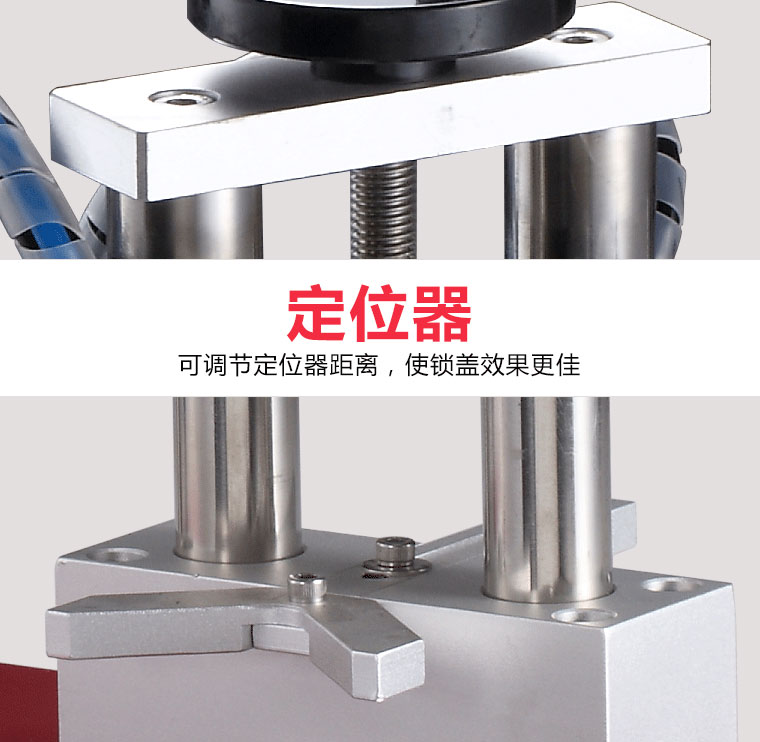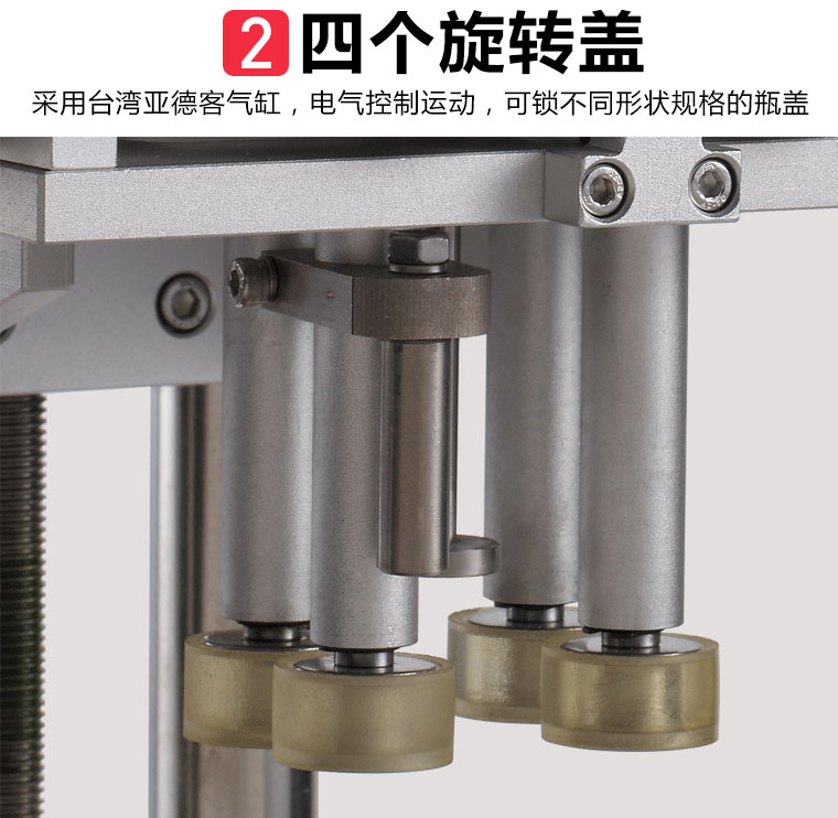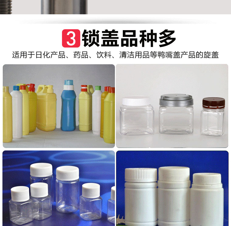 旋蓋機電氣控制運動,穩定性強;設有定位裝置,旋蓋標準,操作方便;鎖蓋范圍寬,可鎖不同形狀規格的瓶蓋;完善了噴頭、泵頭、噴霧泵、手扣式噴槍旋蓋難的問題;鎖蓋轉速可調,可根據不同瓶蓋調節松緊度。自動鎖蓋機的的適用用于各種日化、醫藥、化工行業的噴頭/泵頭/噴霧泵/手扣式噴槍的瓶蓋鎖蓋機械。
