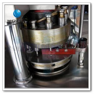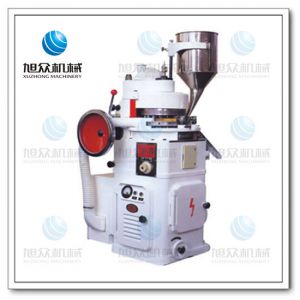 本機用以將各種顆粒狀原料壓制成圓形片劑,最適合于小批量生產。其特點是轉盤上可裝15-19付沖模,旋轉一周即可壓制15-19片。轉盤速度、物料的充填深度、壓片厚度均可調節。機上的機械緩沖裝置可避免過載而引起的機件損壞。機體一側配有吸粉箱,通過吸咀可吸取機器運轉時產生的粉塵,避免粘結堵塞。