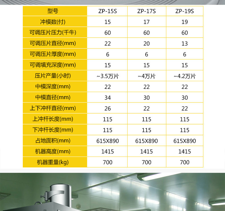 名稱ZP-15/17/19S不銹鋼旋轉(zhuǎn)式壓片機(jī) 電源 功率 產(chǎn)量 尺寸 重量 規(guī)格 其他
