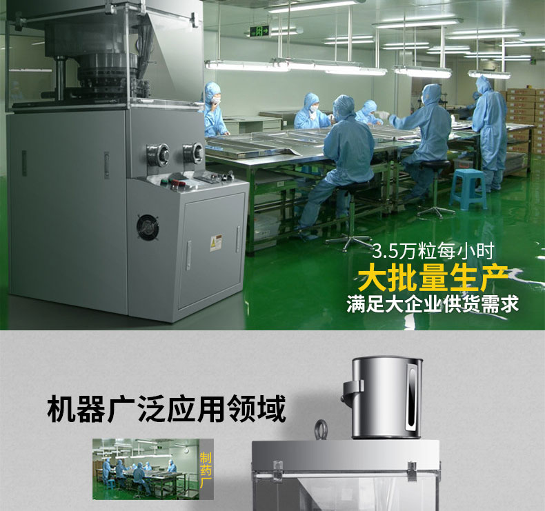 ZP-15S/17S/19S不銹鋼旋轉(zhuǎn)式壓片機(jī)是一種自動(dòng)旋轉(zhuǎn)連續(xù)壓片的機(jī)器。它主要用于制藥、化工、陶瓷、食品、電子、塑料及粉末冶金等工業(yè)。本機(jī)適用于把各種顆粒狀原料壓制成片劑,而不適用于半固體、潮濕粉子和無(wú)顆粒特細(xì)粉末壓制。