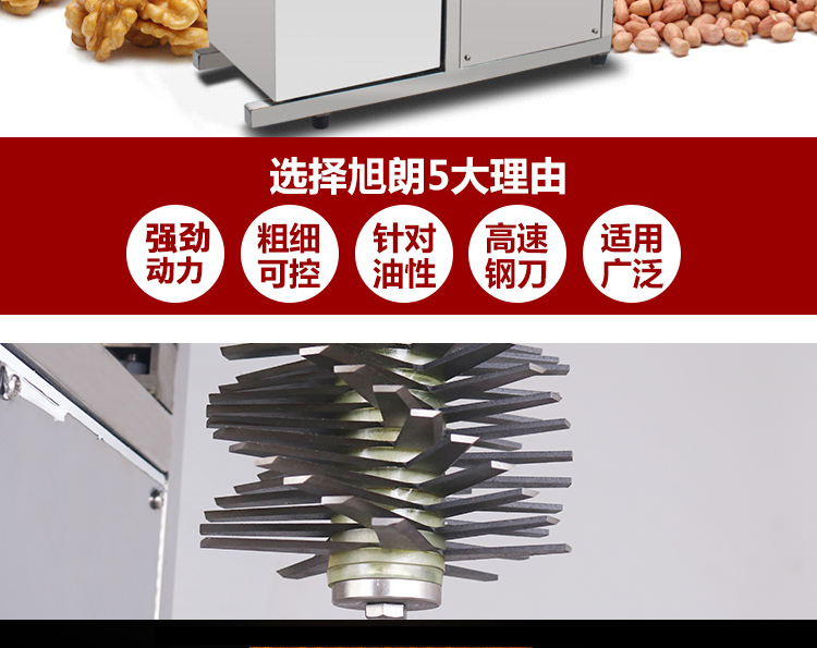 2、A153芝麻打碎機采用高速鋼刀片的形式對物料進行高速切碎,因接觸面小而速度快,從而達到不出油的效果。