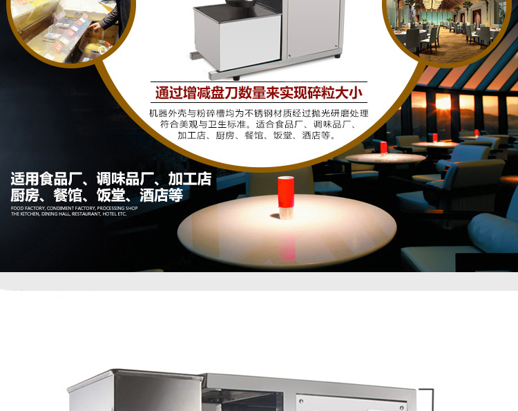 4、本機可通過增減盤刀數量來實現碎粒大小。盤刀超多,碎粒越細;盤刀越少,碎粒越粗。
