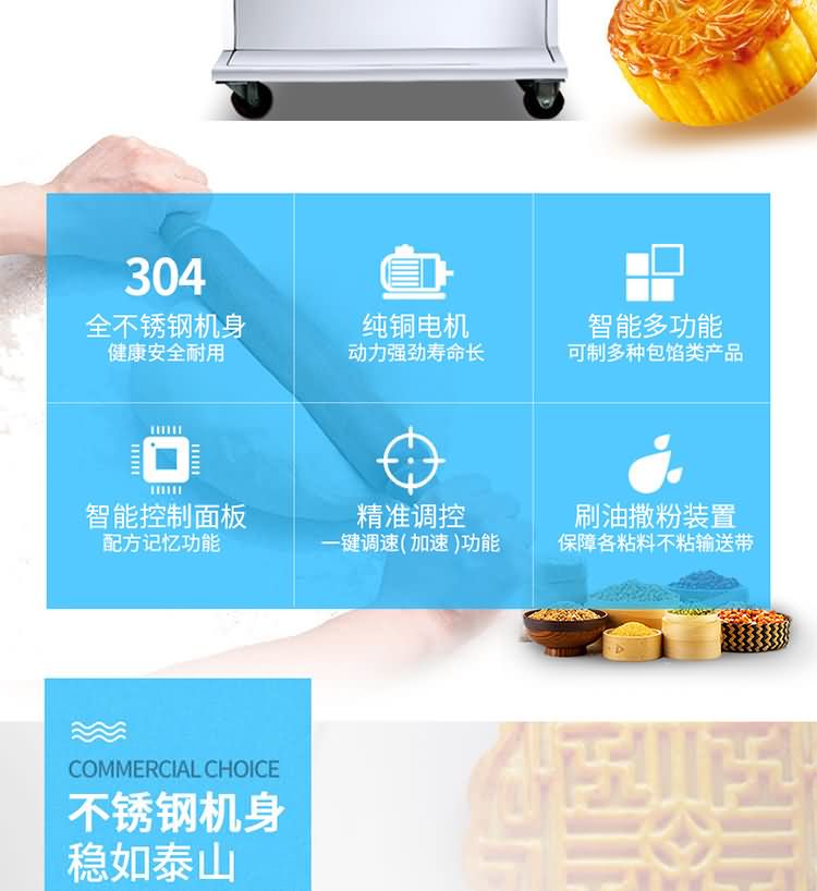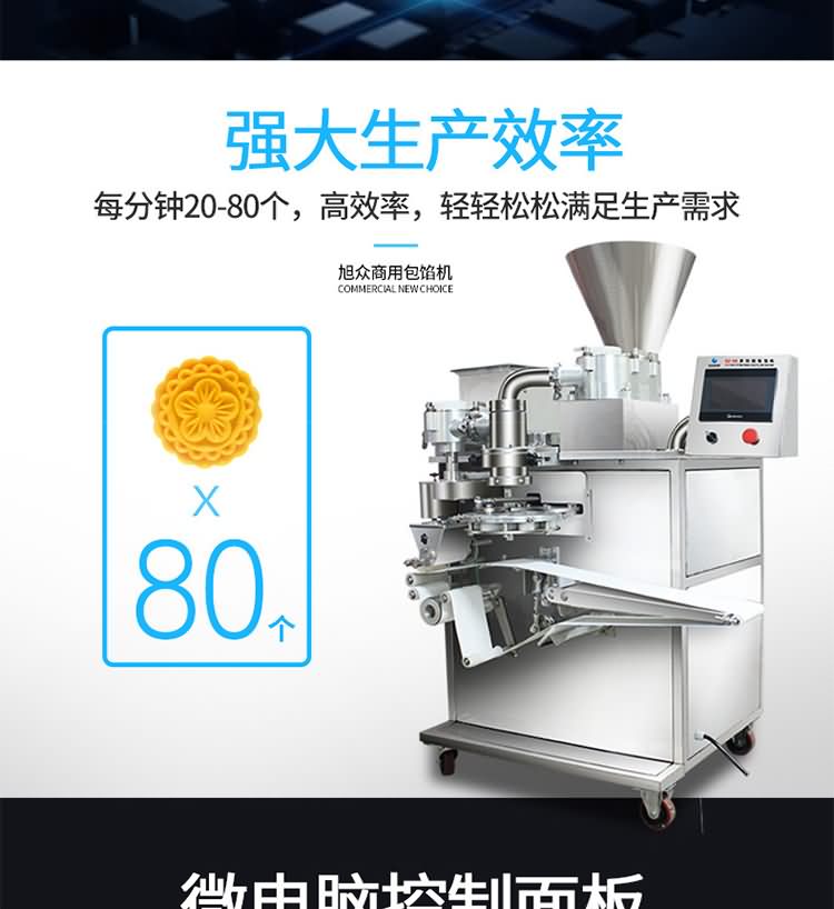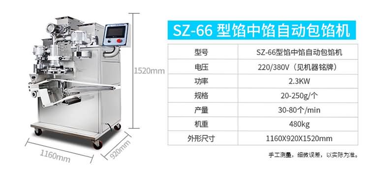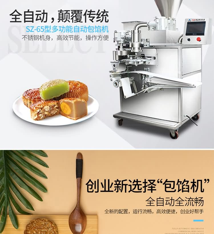 SZ-65型多功能包餡機(jī),可生產(chǎn)豆沙、蓮蓉、五仁餡等較干餡料的包餡類產(chǎn)品,制出的產(chǎn)品餡、皮比例可任意調(diào)整,制品大小統(tǒng)一,外形美觀。