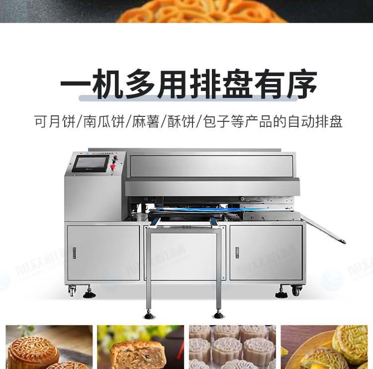 旭眾智能T100排盤機是月餅機,包子機,酥餅機,糍粑機,等需排盤的食品生產線伴侶,多樣化排盤方式可在機器觸摸屏一鍵操作,標準橫式排盤,交叉排盤,長條排盤,一次性可放不粘烤盤120個,帶孔烤盤約200個,實現降低人工成本,增加生產速度,加大利潤增長,功能強大,機器操作簡單。