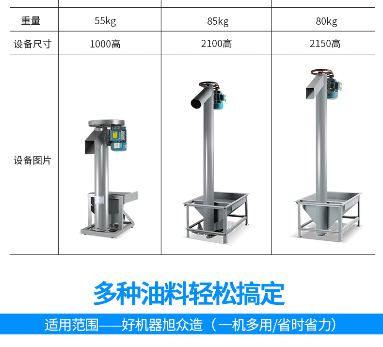 適合提升油料 | 花生、大豆、菜籽、葵花籽、亞麻籽、茶籽等,主要用于豆餅提升和裝袋,有自動破碎豆餅功能 | 花生、大豆、菜籽、葵花籽、亞麻籽、茶籽等,此提升機有豆餅破碎和提升功能,主要用于生榨和兩次壓榨 | 帶殼花生、茶籽等 |