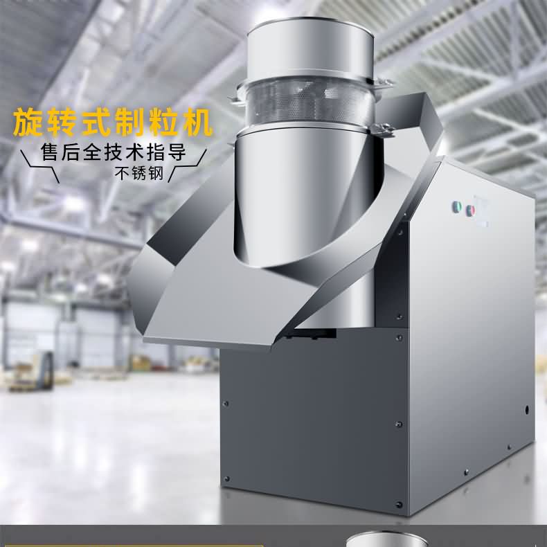 搖擺式顆粒機制得的顆粒一般粒徑分布均勻,有利于濕粒均勻干燥。它的主要特點為旋轉為旋轉滾筒的轉速可以調節,篩網裝卸容易,還可適當調節其松緊。機械傳動系統全部密封在機體內,并附有調節系統,提高了機件的壽命。但由于成粒過程是由滾筒直接壓迫篩網而成粒的,物料對篩網的擠壓力的摩擦力均較大。使用金屬篩網時易產生金屬污染處方,而尼龍篩網由于容易破損需經常更換,在使用時應加以注意。