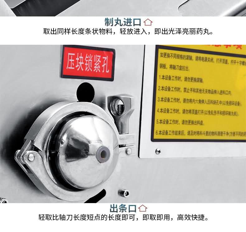 適用于制藥廠、醫院、藥店、診所、食品行業。中藥水丸、蜜丸、各種小丸,并有揉藥團功能,標配6MM規格,可另外購買3-12mm藥丸模具。